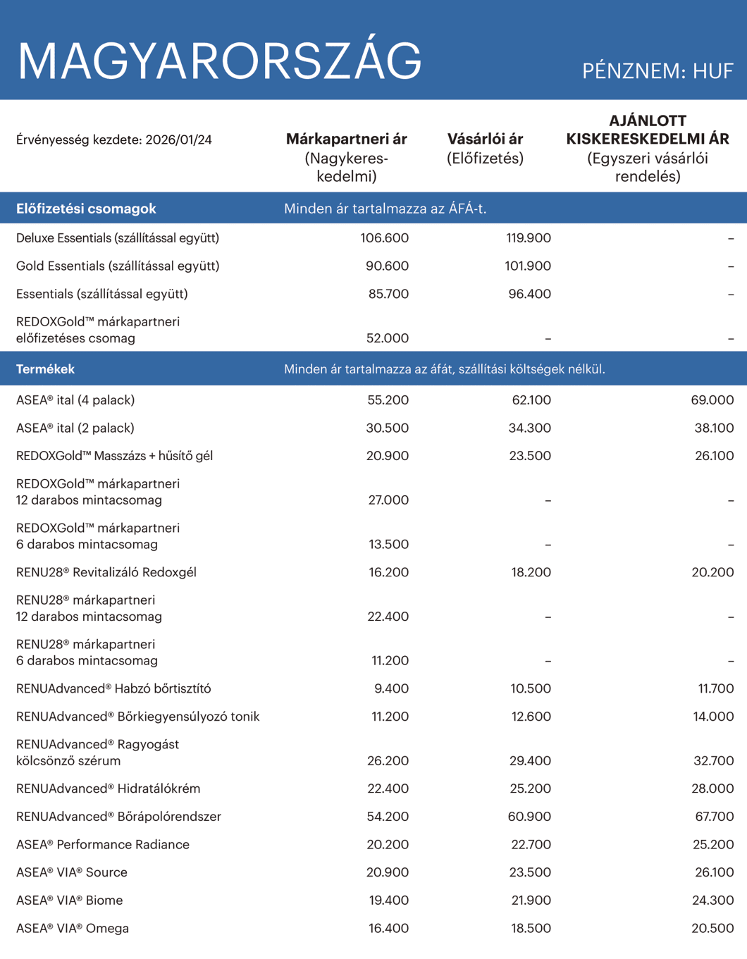 2026. január 24-től az ASEA új, többszintű árazást vezet be az ASEA One rendszerhez igazodva. Három árszint kerül bevezetésre: egyszeri vásárlói árak, előfizetéses árak, valamint márkapartneri (nagykereskedelmi) árak. Az új rendszer egy általános árkorrekcióval is együtt jár, amely a globális gazdasági környezethez való alkalmazkodást szolgálja.